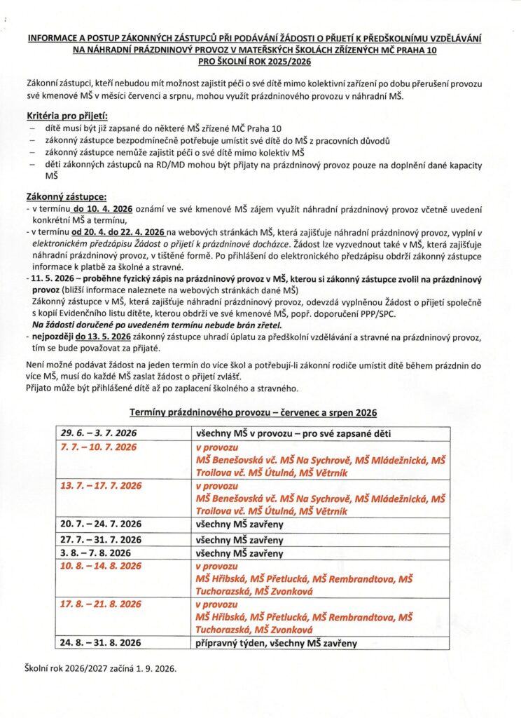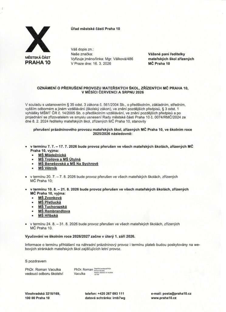 INFORMACE K PRÁZDNINOVÉMU PROVOZU ČERVENEC – SRPEN 2026